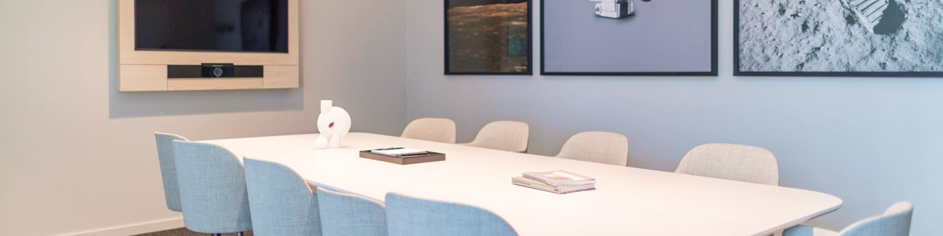 A larger and bright meeting room suitable for meetings of up to 10 people. It features fixed board seating with a long table that includes a TV & webcam, whiteboard, and notepads with pens.