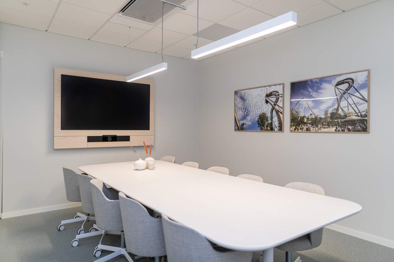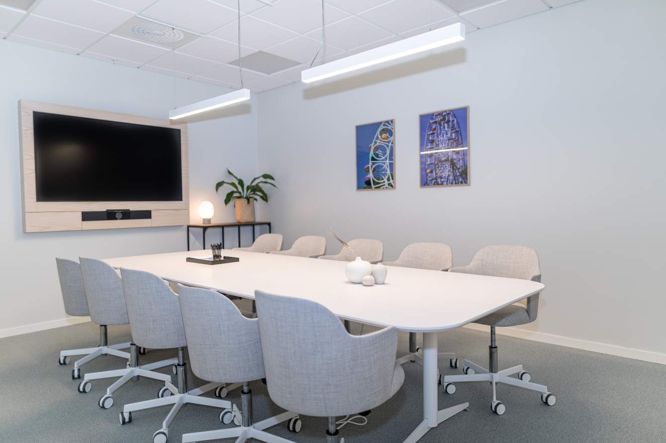 A large and airy meeting room with a view, suitable for up to 16 people. The room is inspired by the camera company Hasselblad. It offers a fixed board seating and includes a TV & webcam, whiteboard, and notepads with pens.