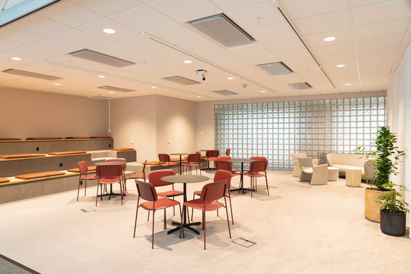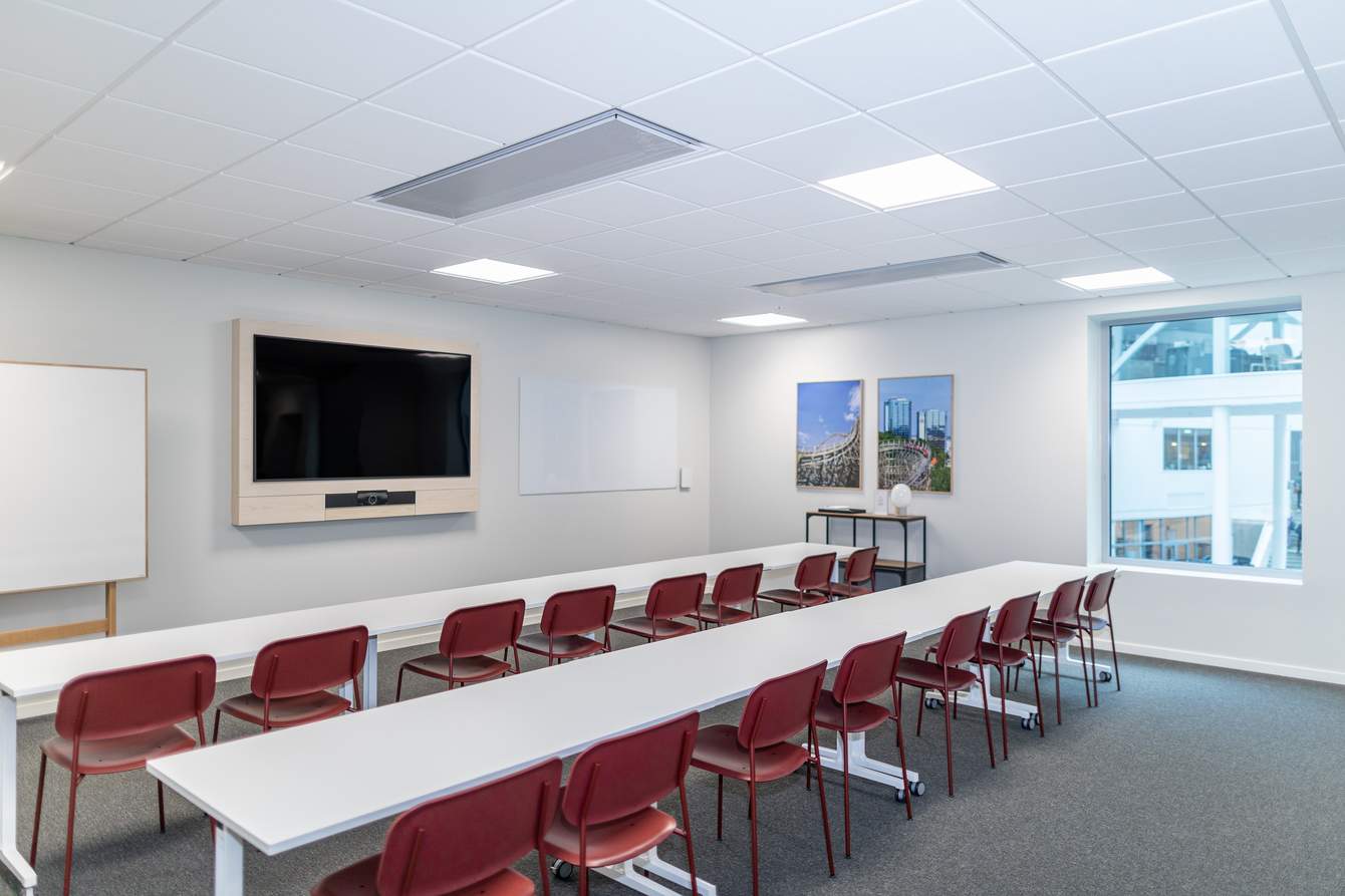 Lindholmen’s event arena is one of our larger ones. It’s bright and airy and has with glass doors. The space is suitable for meetings of up to 55 people. It also features a tiered area at the back of the room, and can be furnished in any seating arrangement desired. It includes a TV, webcam, whiteboard, and notepads with pens.