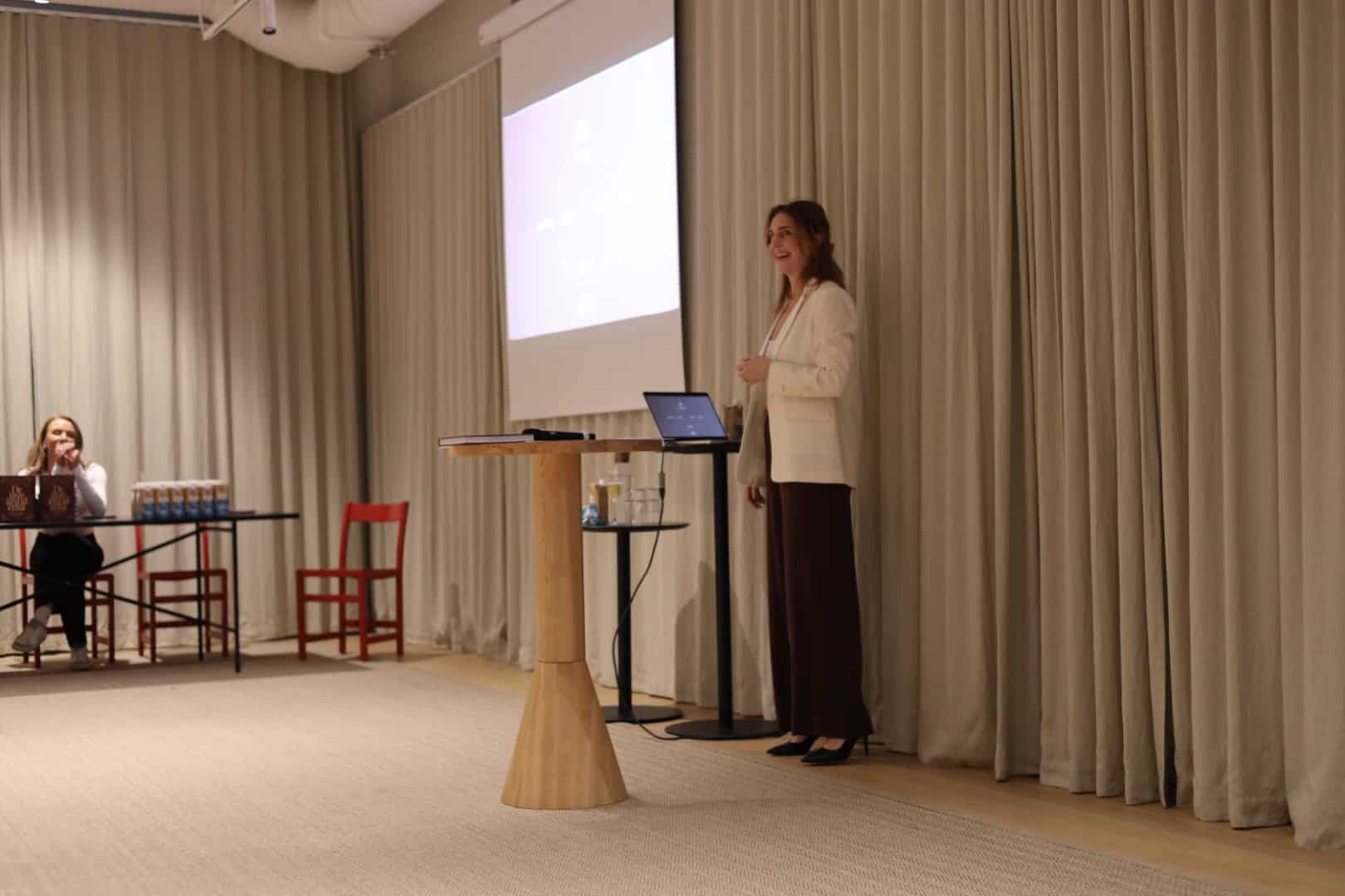 Sheila Arnell, yogalärare och författare, höll en inspirerande föreläsning om delade insikter från sin bok ”De inre årstiderna”, där hon lyfte hur medvetenhet om den kvinnliga kroppen kan vara en kraft för effektivitet, återhämtning och lönsamhet – både i arbetslivet och privat.