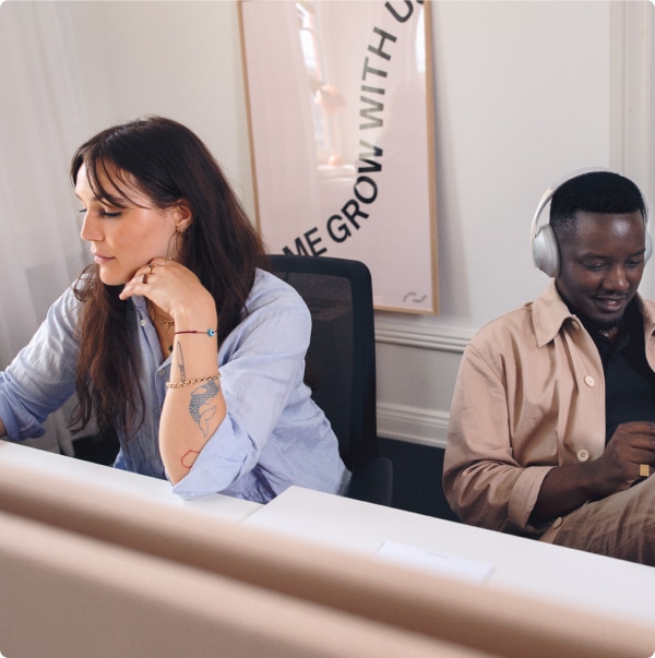 En dedikerad arbetsplats som är din egen. Komplett med höj- och sänkbart skrivbord och ergonomisk stol. Pynta med din ljusblåa musmatta eller bilder på nära och kära. Och kom och gå som du vill – vi står kvar. Eller ännu viktigare: Ditt skrivbord står kvar.